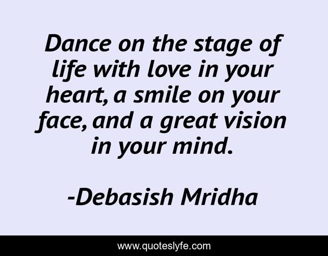 This page presents the quote "Dance on the stage of life with love in your heart, a smile on your face, and a great vision in your mind.". Author of this quote is Debasish Mridha. This quote is about stage-of-life, philosophy, debasish-mridha, quotes, inspirational, life-wisdom-power-of-a-smile, enthusiasm, smile-on-your-face, great-vision,.