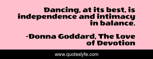This page presents the quote "Dancing, at its best, is independence and intimacy in balance.". Author of this quote is Donna Goddard, The Love of Devotion. This quote is about arts, love, dancing, music, ballroom-dancing, intimacy, affection, independence,.