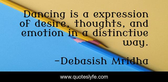 This page presents the quote "Dancing is a expression of desire, thoughts, and emotion in a distinctive way.". Author of this quote is Debasish Mridha. This quote is about desire, emotion, life, love, knowledge, inspirational, distinctive, philosophy, affection,.