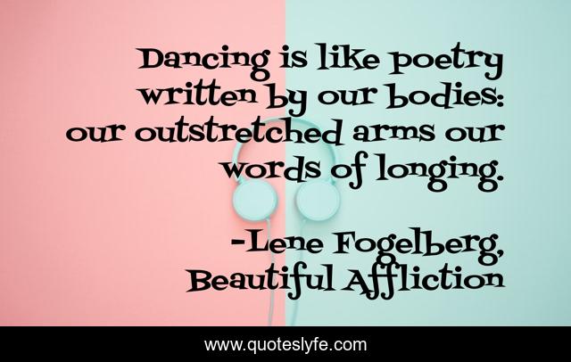 This page presents the quote "Dancing is like poetry written by our bodies: our outstretched arms our words of longing.". Author of this quote is Lene Fogelberg, Beautiful Affliction. This quote is about enthusiasm, poetry, inspirational, dancing,.
