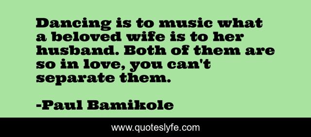 This page presents the quote "Dancing is to music what a beloved wife is to her husband. Both of them are so in love, you can't separate them.". Author of this quote is Paul Bamikole. This quote is about dance, art, love, affection, music,.