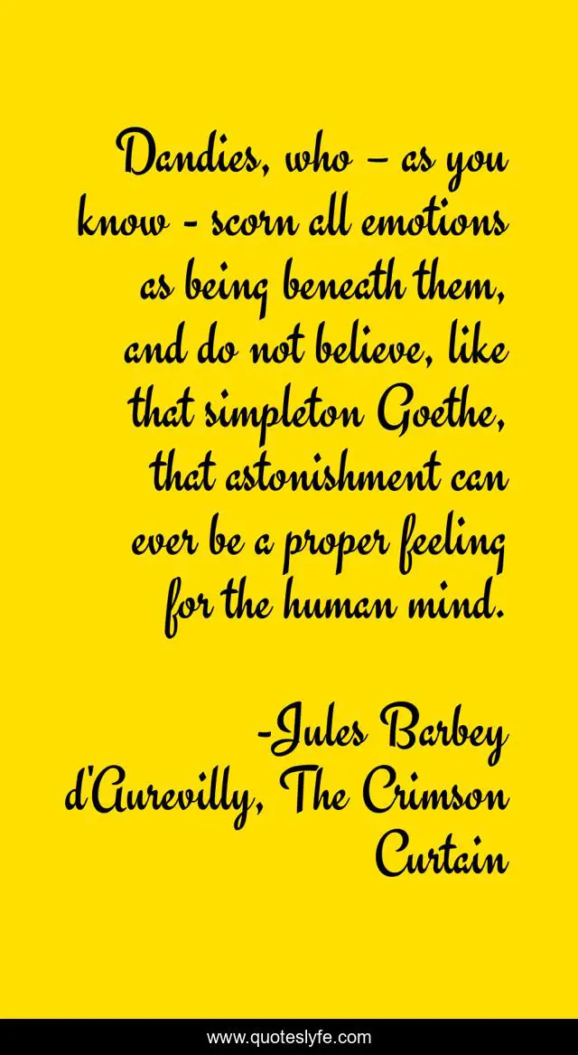 This page presents the quote "Dandies, who – as you know - scorn all emotions as being beneath them, and do not believe, like that simpleton Goethe, that astonishment can ever be a proper feeling for the human mind.". Author of this quote is Jules Barbey d'Aurevilly, The Crimson Curtain. This quote is about emotion, astonishment, goethe, dandies,.
