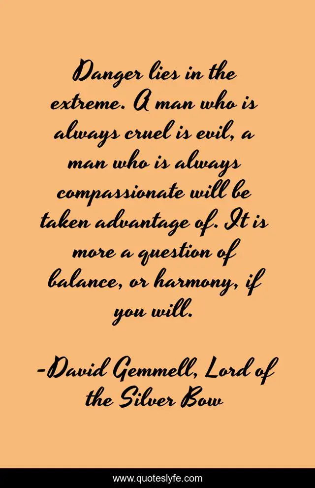 This page presents the quote "Danger lies in the extreme. A man who is always cruel is evil, a man who is always compassionate will be taken advantage of. It is more a question of balance, or harmony, if you will.". Author of this quote is David Gemmell, Lord of the Silver Bow. .