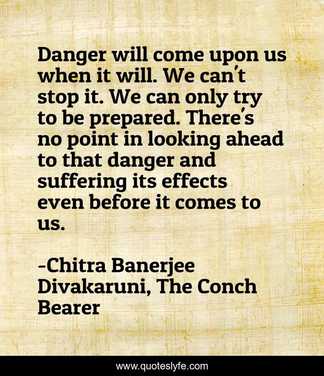 This page presents the quote "Danger will come upon us when it will. We can't stop it. We can only try to be prepared. There's no point in looking ahead to that danger and suffering its effects even before it comes to us.". Author of this quote is Chitra Banerjee Divakaruni, The Conch Bearer. This quote is about anticipation, dread, danger,.