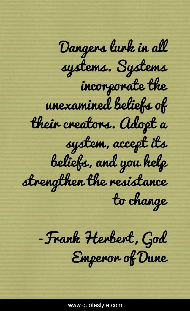 This page presents the quote "Dangers lurk in all systems. Systems incorporate the unexamined beliefs of their creators. Adopt a system, accept its beliefs, and you help strengthen the resistance to change". Author of this quote is Frank Herbert, God Emperor of Dune. This quote is about belief, systems,.