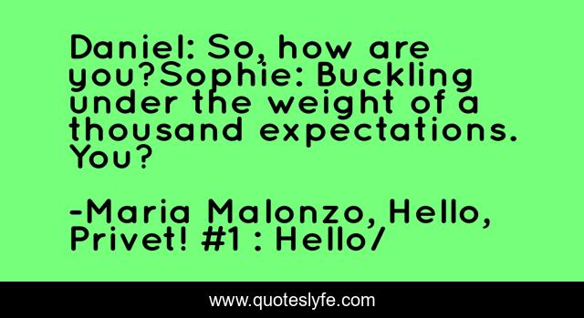 This page presents the quote "Daniel: So, how are you?Sophie: Buckling under the weight of a thousand expectations. You?". Author of this quote is Maria Malonzo, Hello, Privet! #1 : Hello/Привет. This quote is about pressure, humor, expectations,.