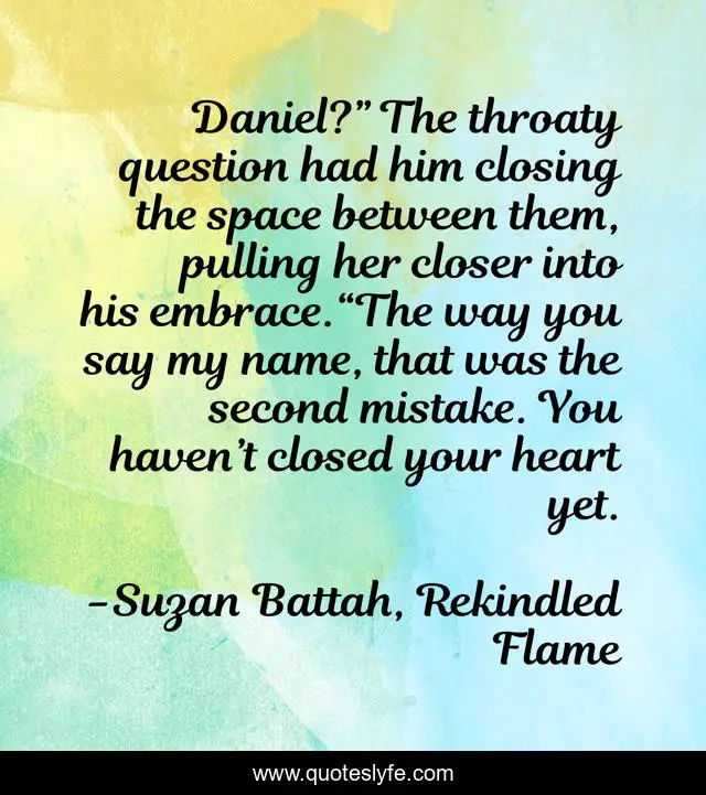 This page presents the quote "Daniel?” The throaty question had him closing the space between them, pulling her closer into his embrace.“The way you say my name, that was the second mistake. You haven’t closed your heart yet.". Author of this quote is Suzan Battah, Rekindled Flame. This quote is about romance, true-love, second-chances, soul-mates,.