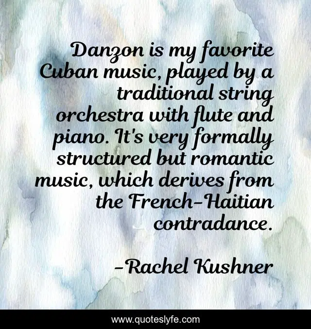 This page presents the quote "Danzon is my favorite Cuban music, played by a traditional string orchestra with flute and piano. It's very formally structured but romantic music, which derives from the French-Haitian contradance.". Author of this quote is Rachel Kushner. This quote is about orchestra, favorite, music,.