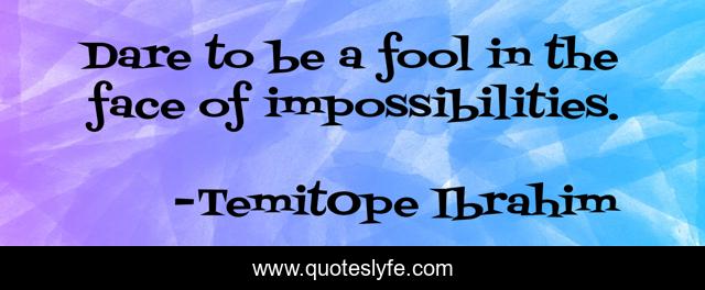 This page presents the quote "Dare to be a fool in the face of impossibilities.". Author of this quote is TemitOpe Ibrahim. This quote is about fool, miracles, confidence, positive, motivational, optimistic, inspirational, impossible, enthusiasm,.