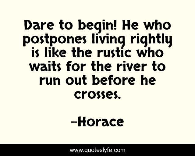 This page presents the quote "Dare to begin! He who postpones living rightly is like the rustic who waits for the river to run out before he crosses.". Author of this quote is Horace. .