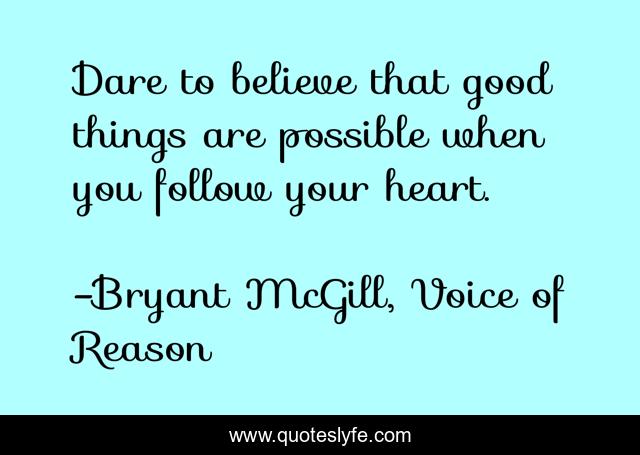 This page presents the quote "Dare to believe that good things are possible when you follow your heart.". Author of this quote is Bryant McGill, Voice of Reason. This quote is about believe, love, goals, affection,.