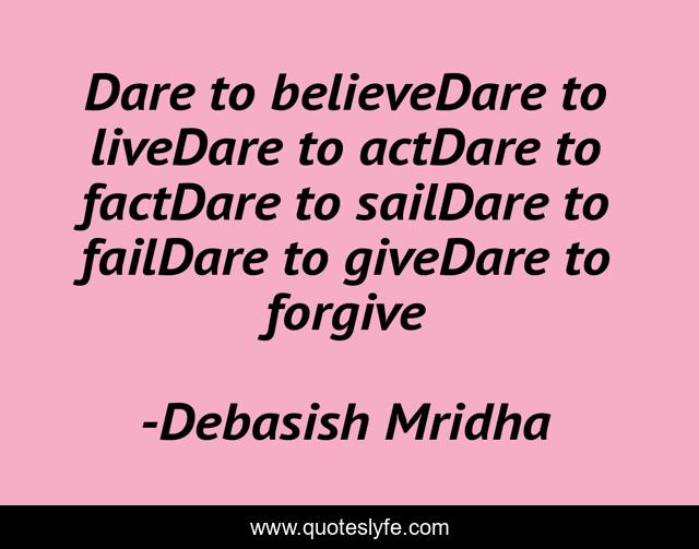 This page presents the quote "Dare to believeDare to liveDare to actDare to factDare to sailDare to failDare to giveDare to forgive". Author of this quote is Debasish Mridha. This quote is about life, debasish, mridha, philosophy, forgive, live, act, believe, dare,.