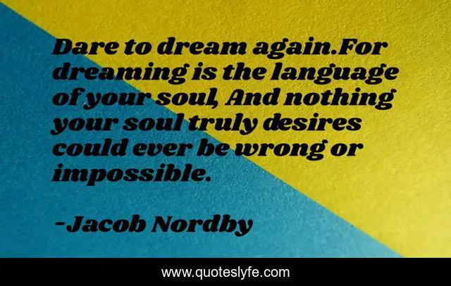 This page presents the quote "Dare to dream again.For dreaming is the language of your soul, And nothing your soul truly desires could ever be wrong or impossible.". Author of this quote is Jacob Nordby. This quote is about desires, soul, inspirational, enthusiasm, dreams-inspirational, dreams,.