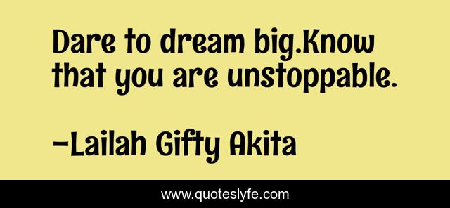 This page presents the quote "Dare to dream big.Know that you are unstoppable.". Author of this quote is Lailah Gifty Akita. This quote is about dream, dare,.