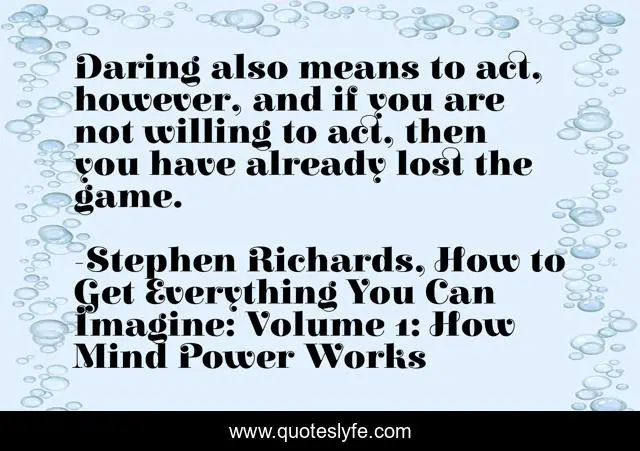 This page presents the quote "Daring also means to act, however, and if you are not willing to act, then you have already lost the game.". Author of this quote is Stephen Richards, How to Get Everything You Can Imagine: Volume 1: How Mind Power Works. This quote is about stephen-richards, daring, wishes-fulfilled,.