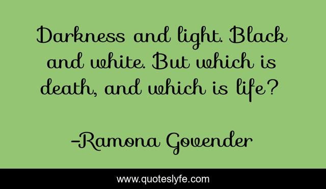 This page presents the quote "Darkness and light. Black and white. But which is death, and which is life?". Author of this quote is Ramona Govender. This quote is about light, life, death, darkness,.