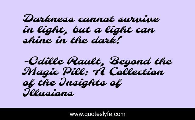"Odille Rault, Beyond the Magic Pill: A Collection of the Insights of Illusions Quotes." Quoteslyfe.com, 2025. Fri. 05 Dec. 2025. <https://www.quoteslyfe.com/quote/Darkness-cannot-survive-in-light-but-a-14178>.
