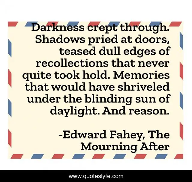 This page presents the quote "Darkness crept through. Shadows pried at doors, teased dull edges of recollections that never quite took hold. Memories that would have shriveled under the blinding sun of daylight. And reason.". Author of this quote is Edward Fahey, The Mourning After. This quote is about literary, literary-fiction, moody-writing, literature, fiction,.