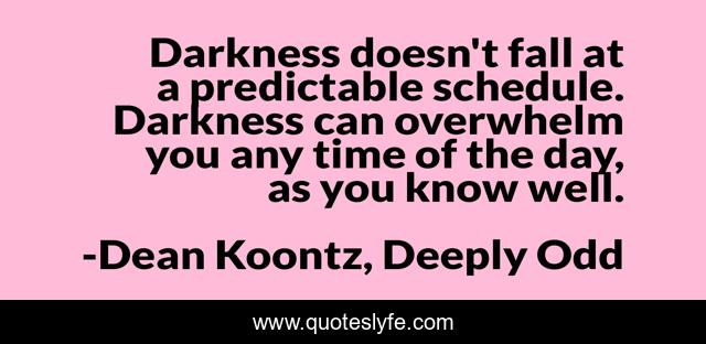 This page presents the quote "Darkness doesn't fall at a predictable schedule. Darkness can overwhelm you any time of the day, as you know well.". Author of this quote is Dean Koontz, Deeply Odd. This quote is about darkness, unscheduled, odd-thomas, annamaria,.