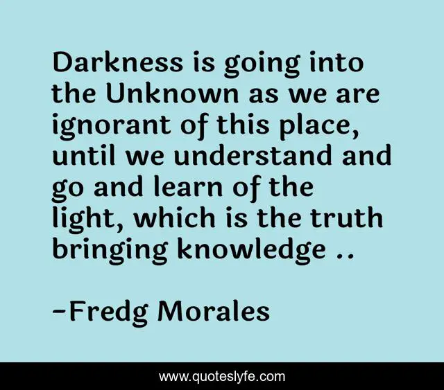 This page presents the quote "Darkness is going into the Unknown as we are ignorant of this place, until we understand and go and learn of the light, which is the truth bringing knowledge ..". Author of this quote is Fredg Morales. .