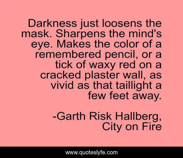 This page presents the quote "Darkness just loosens the mask. Sharpens the mind's eye. Makes the color of a remembered pencil, or a tick of waxy red on a cracked plaster wall, as vivid as that taillight a few feet away.". Author of this quote is Garth Risk Hallberg, City on Fire. This quote is about city-on-fire, darkness, garth-risk-hallberg, mask, perspective, memory,.