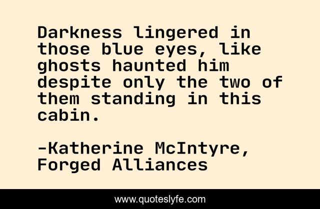 This page presents the quote "Darkness lingered in those blue eyes, like ghosts haunted him despite only the two of them standing in this cabin.". Author of this quote is Katherine McIntyre, Forged Alliances. This quote is about hero, darkness, past-trauma, shifter-romance, romance, shifters, brooding, haunted, ghosts,.