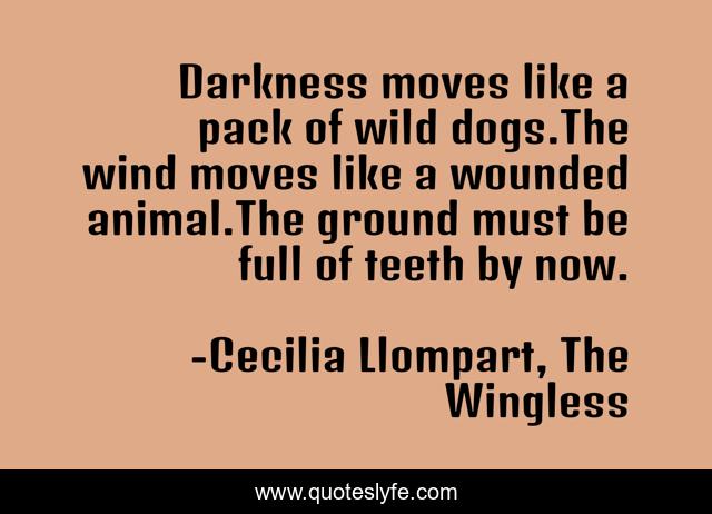 This page presents the quote "Darkness moves like a pack of wild dogs.The wind moves like a wounded animal.The ground must be full of teeth by now.". Author of this quote is Cecilia Llompart, The Wingless. This quote is about dogs, wound, poetry, wind, darkness,.