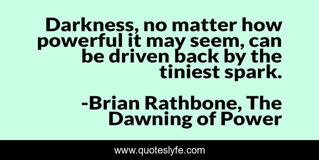 This page presents the quote "Darkness, no matter how powerful it may seem, can be driven back by the tiniest spark.". Author of this quote is Brian Rathbone, The Dawning of Power. This quote is about fantasy, the-dawning-of-power, godsland, rathbone,.