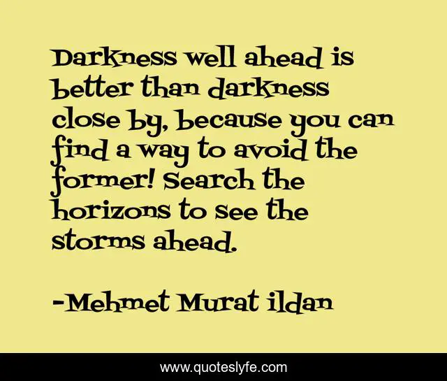 This page presents the quote "Darkness well ahead is better than darkness close by, because you can find a way to avoid the former! Search the horizons to see the storms ahead.". Author of this quote is Mehmet Murat ildan. .