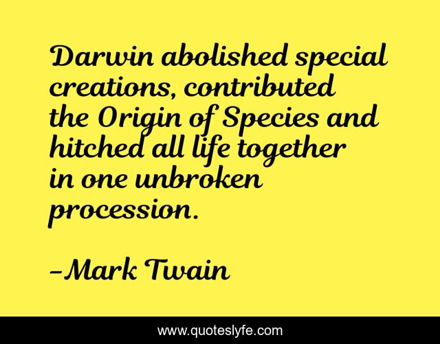This page presents the quote "Darwin abolished special creations, contributed the Origin of Species and hitched all life together in one unbroken procession.". Author of this quote is Mark Twain. This quote is about biology, origin-of-species, creation, life, special-creation, charles-darwin, darwin, creationism,.