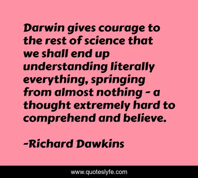 This page presents the quote "Darwin gives courage to the rest of science that we shall end up understanding literally everything, springing from almost nothing - a thought extremely hard to comprehend and believe.". Author of this quote is Richard Dawkins. This quote is about science, believe,.