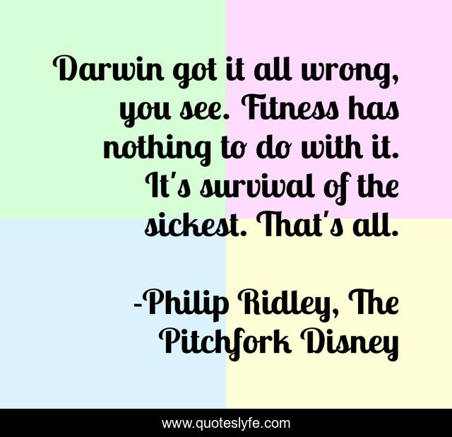 This page presents the quote "Darwin got it all wrong, you see. Fitness has nothing to do with it. It's survival of the sickest. That's all.". Author of this quote is Philip Ridley, The Pitchfork Disney. This quote is about evolution, darwin, horror, sick,.