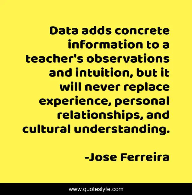 This page presents the quote "Data adds concrete information to a teacher's observations and intuition, but it will never replace experience, personal relationships, and cultural understanding.". Author of this quote is Jose Ferreira. This quote is about experience, understanding,.