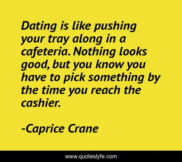 This page presents the quote "Dating is like pushing your tray along in a cafeteria. Nothing looks good, but you know you have to pick something by the time you reach the cashier.". Author of this quote is Caprice Crane. This quote is about dating, humor,.