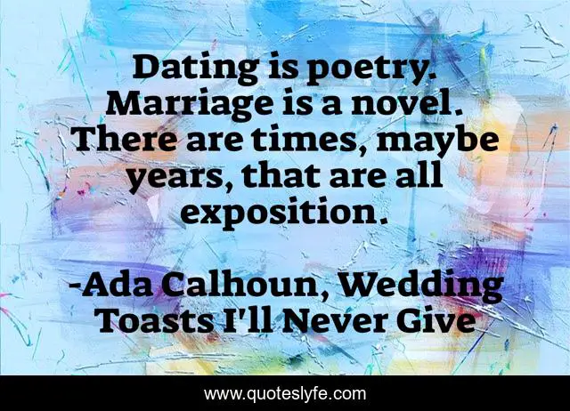 This page presents the quote "Dating is poetry. Marriage is a novel. There are times, maybe years, that are all exposition.". Author of this quote is Ada Calhoun, Wedding Toasts I'll Never Give. This quote is about dating, marriage,.
