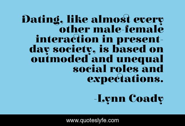 This page presents the quote "Dating, like almost every other male-female interaction in present-day society, is based on outmoded and unequal social roles and expectations.". Author of this quote is Lynn Coady. This quote is about society, expectations,.
