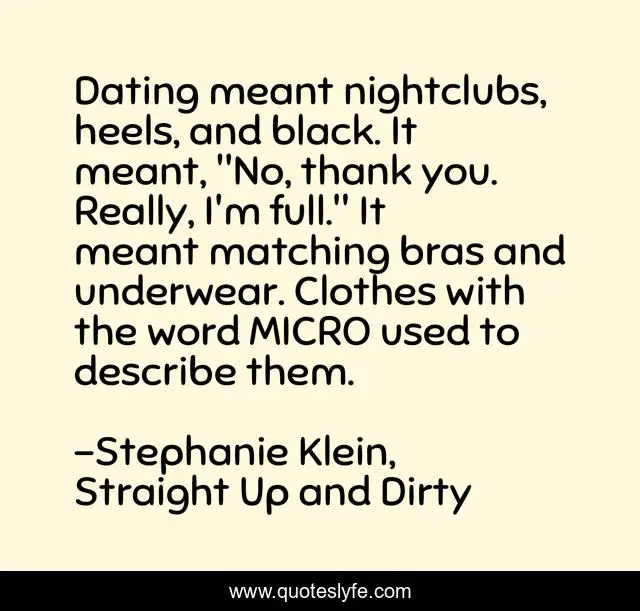 This page presents the quote "Dating meant nightclubs, heels, and black. It meant, "No, thank you. Really, I'm full." It meant matching bras and underwear. Clothes with the word MICRO used to describe them.". Author of this quote is Stephanie Klein, Straight Up and Dirty. This quote is about dating, humor,.