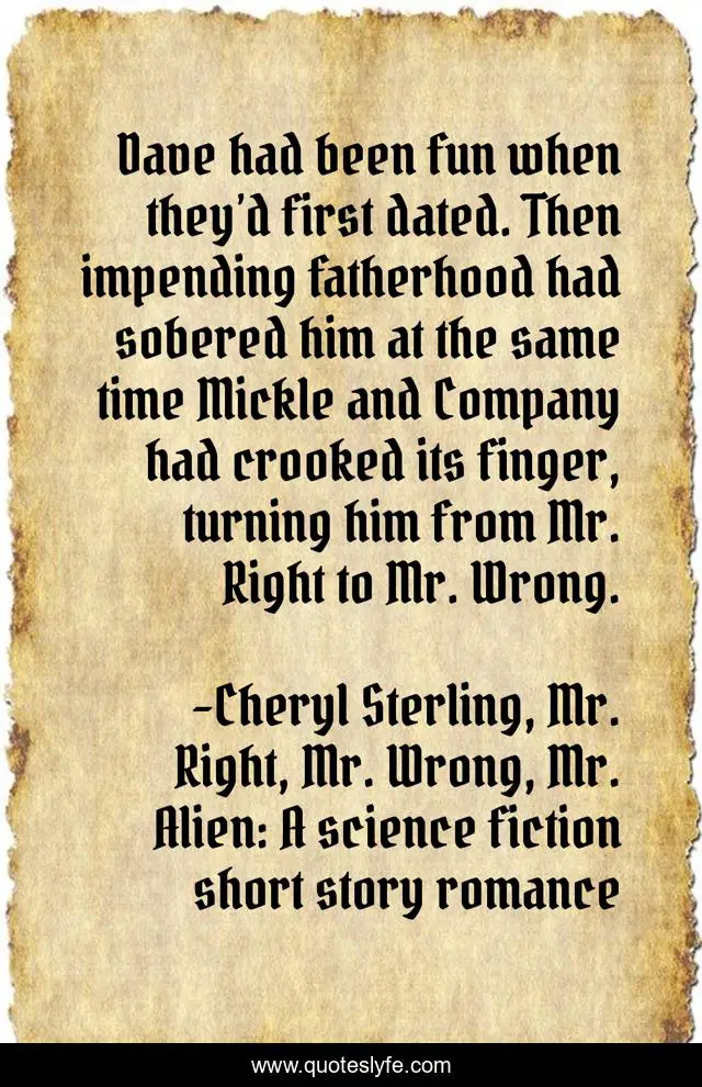 This page presents the quote "Dave had been fun when they’d first dated. Then impending fatherhood had sobered him at the same time Mickle and Company had crooked its finger, turning him from Mr. Right to Mr. Wrong.". Author of this quote is Cheryl Sterling, Mr. Right, Mr. Wrong, Mr. Alien: A science fiction short story romance. This quote is about alien, alien-romance, humor, sci-fi,.
