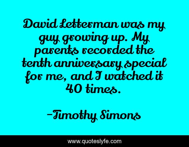 This page presents the quote "David Letterman was my guy growing up. My parents recorded the tenth anniversary special for me, and I watched it 40 times.". Author of this quote is Timothy Simons. This quote is about me, parents, growing up,.