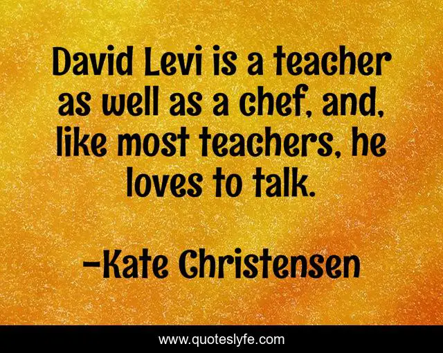 This page presents the quote "David Levi is a teacher as well as a chef, and, like most teachers, he loves to talk.". Author of this quote is Kate Christensen. This quote is about chef, teachers, talk,.