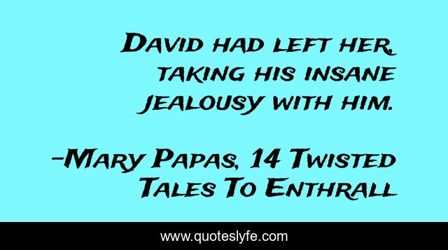 This page presents the quote "David had left her, taking his insane jealousy with him.". Author of this quote is Mary Papas, 14 Twisted Tales To Enthrall. This quote is about authors, books, stories, humour, writing,.