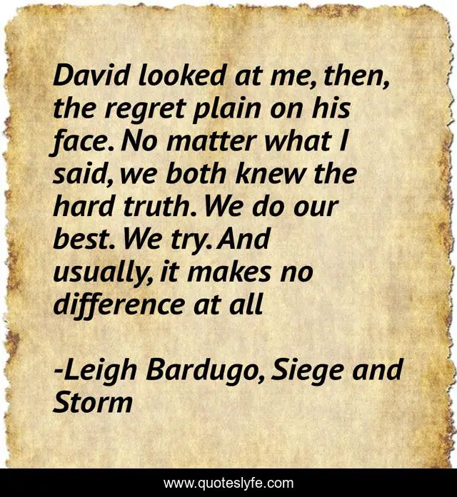 This page presents the quote "David looked at me, then, the regret plain on his face. No matter what I said, we both knew the hard truth. We do our best. We try. And usually, it makes no difference at all". Author of this quote is Leigh Bardugo, Siege and Storm. This quote is about alina, david, siege-and-storm, sad,.