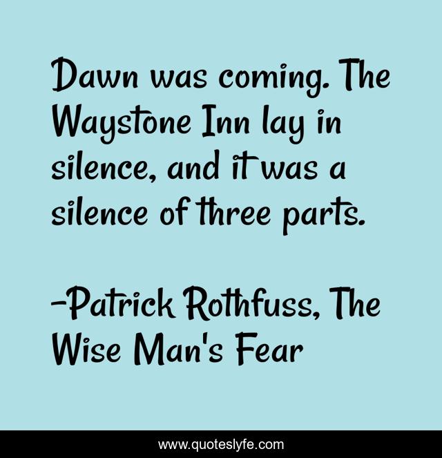 This page presents the quote "Dawn was coming. The Waystone Inn lay in silence, and it was a silence of three parts.". Author of this quote is Patrick Rothfuss, The Wise Man's Fear. .