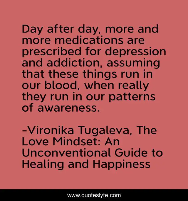 This page presents the quote "Day after day, more and more medications are prescribed for depression and addiction, assuming that these things run in our blood, when really they run in our patterns of awareness.". Author of this quote is Vironika Tugaleva, The Love Mindset: An Unconventional Guide to Healing and Happiness. This quote is about medication, nature-vs-nurture, awareness, self-awareness, addiction, depression,.