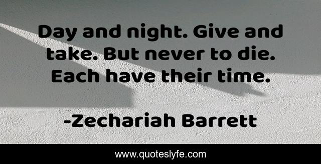This page presents the quote "Day and night. Give and take. But never to die. Each have their time.". Author of this quote is Zechariah Barrett. This quote is about romance, selflessness, transition, day, night,.