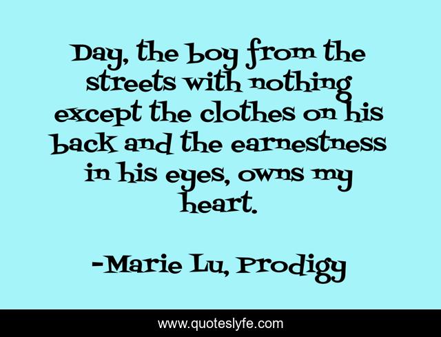 This page presents the quote "Day, the boy from the streets with nothing except the clothes on his back and the earnestness in his eyes, owns my heart.". Author of this quote is Marie Lu, Prodigy. This quote is about june, day, legend,.