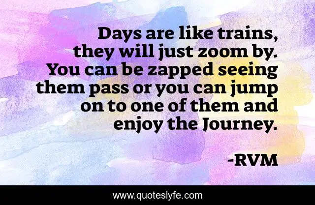 This page presents the quote "Days are like trains, they will just zoom by. You can be zapped seeing them pass or you can jump on to one of them and enjoy the Journey.". Author of this quote is RVM. This quote is about motivation, inspiration,.