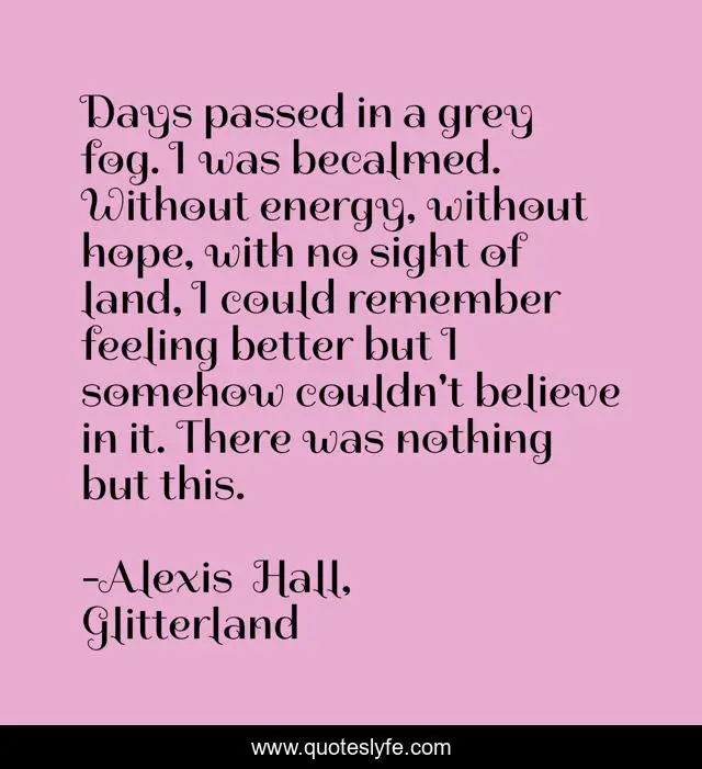 This page presents the quote "Days passed in a grey fog. I was becalmed. Without energy, without hope, with no sight of land, I could remember feeling better but I somehow couldn't believe in it. There was nothing but this.". Author of this quote is Alexis Hall, Glitterland. This quote is about bipolar, depression,.