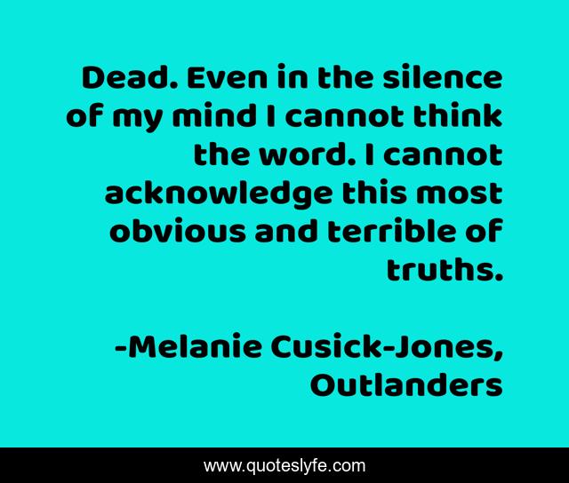 This page presents the quote "Dead. Even in the silence of my mind I cannot think the word. I cannot acknowledge this most obvious and terrible of truths.". Author of this quote is Melanie Cusick-Jones, Outlanders. This quote is about grief, death, grief-and-loss, lovers, love-hurts,.