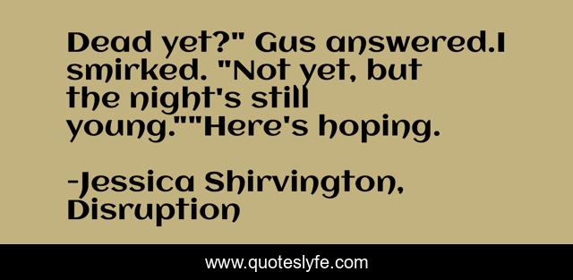 This page presents the quote "Dead yet?" Gus answered.I smirked. "Not yet, but the night's still young.""Here's hoping.". Author of this quote is Jessica Shirvington, Disruption. This quote is about witty, humor, young-adult,.